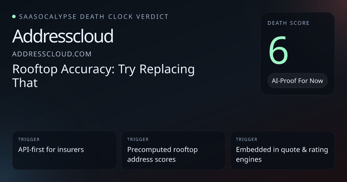 -12 Switching CostPrecomputed address scores, high transaction volume, embedded use in quoting and policy systems, and audit/report outputs imply meaningful data and workflow lock-in.
