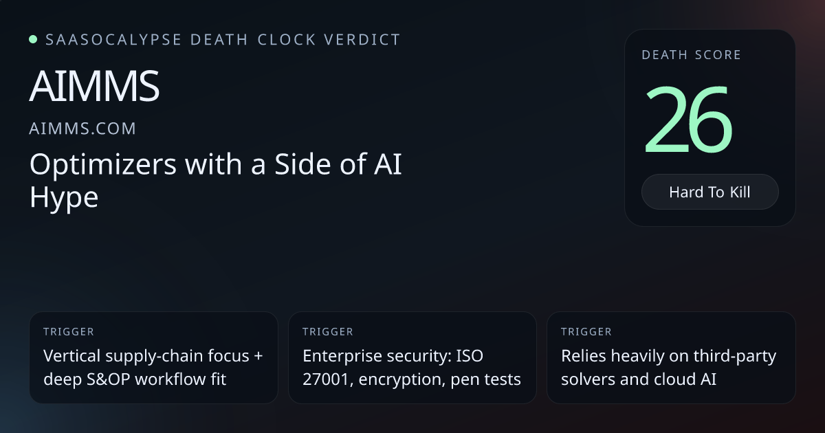 -3 Relative PlacementModest down-adjust: entrenched enterprise integrations, proprietary modelling language, solver ecosystem and long enterprise pedigree make AIMMS slightly safer than a 29 implies.