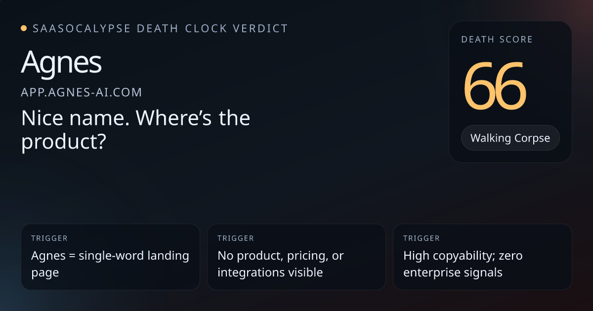 Single-word homepage shows only the brand name 'Agnes'.No product, features, pricing, customers, or AI claims are visible.Page body text: 'Agnes'