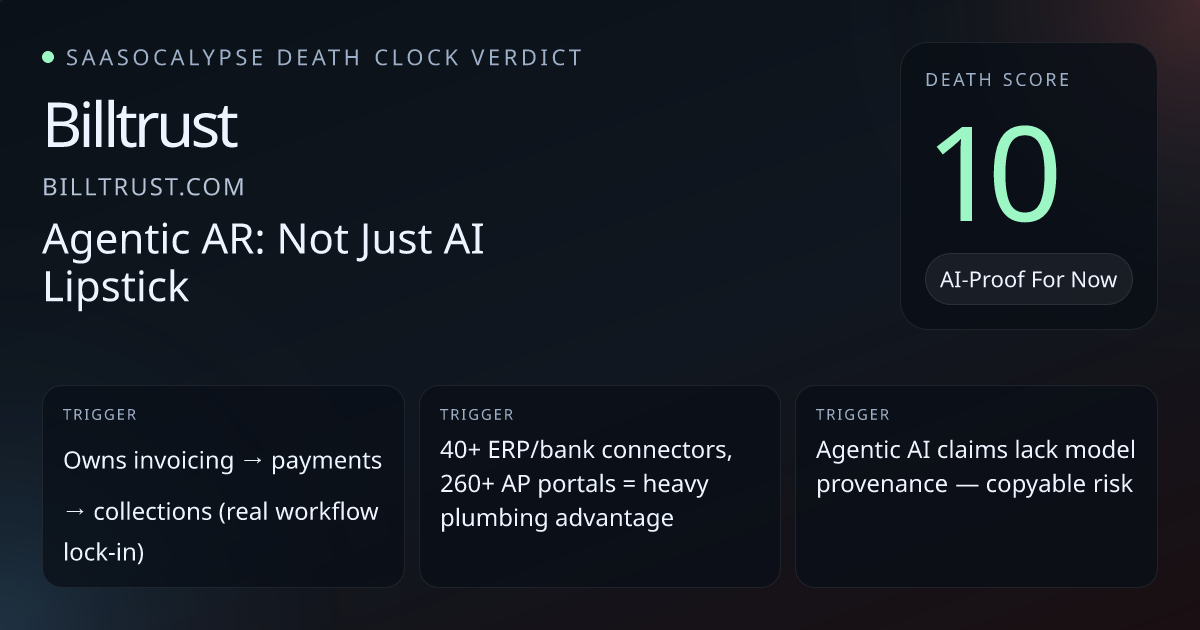+24 Commodity PressureLots of 'AI-powered' and 'Agentic' branding makes core capabilities sound like copyable features, but broad AR coverage and payment/reconciliation glue limit pure commoditization.