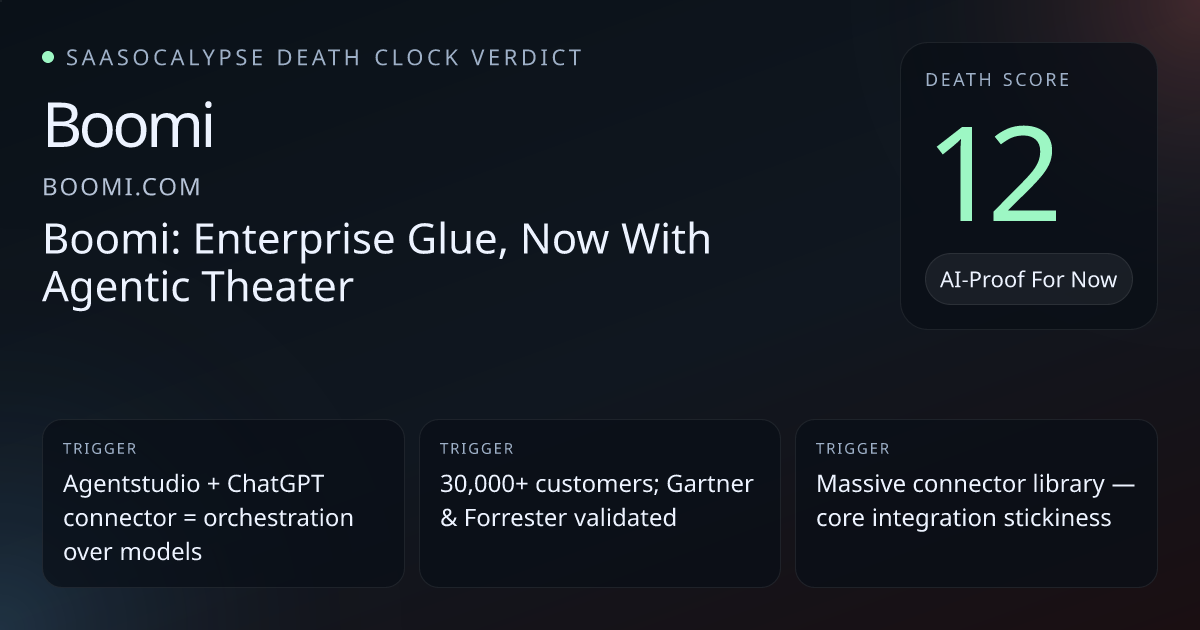 Strong platform defenses: 30,000+ customers, deep connector library (SAP, Oracle, Salesforce, Snowflake), API governance, managed services — these increase switching costs and enterprise embeddedness.Model dependency: explicit ChatGPT connector, RAG mentions, and an agent orchestration layer without visible proprietary LLM IP — raises commodity/replicability risk for the AI surface.Peer anchors: comparable enterprise_platforms that mainly package third‑party models sit in the 'Hard To Kill' band with deathScores ~22–38 (e.g., Airtable 25, ThoughtSpot 24, LeadSquared 24), implying Boomi should be notably more vulnerable than a 2.
