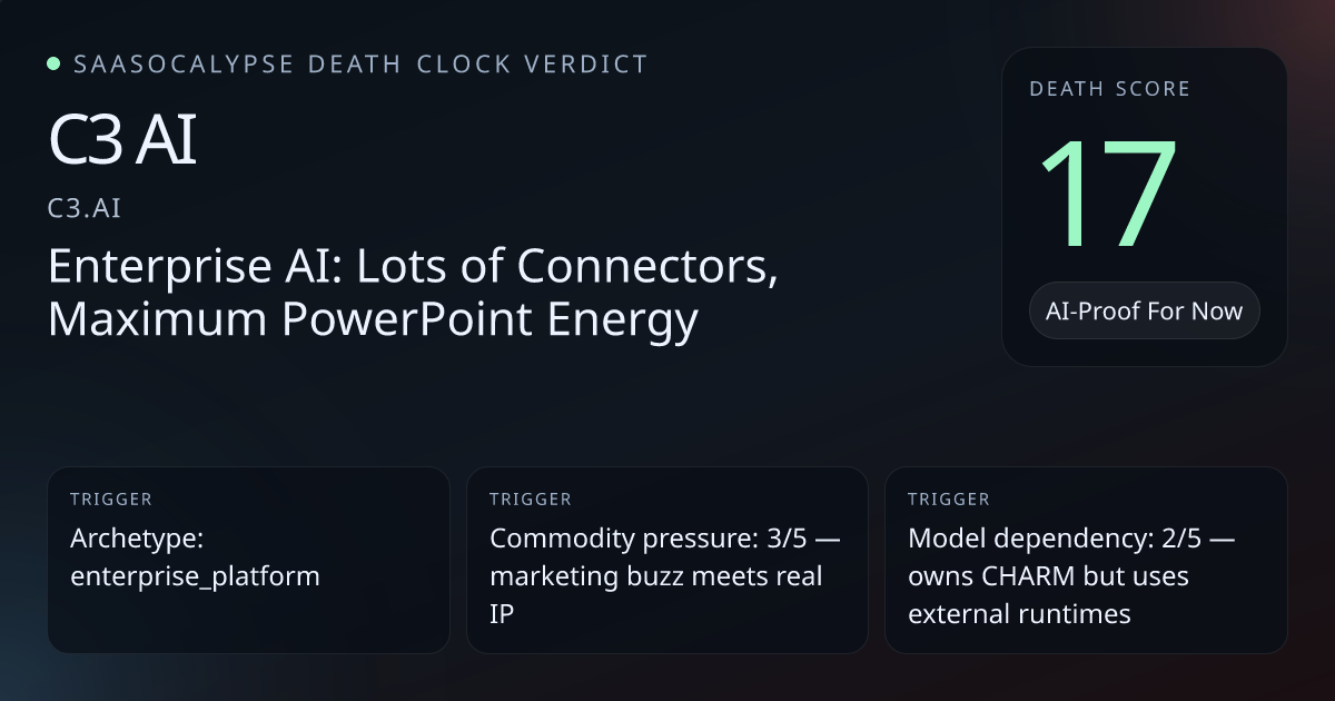 Peer-anchor mean deathScore ~31 (peers clustered 20–58) — C3's 11 is a material outlier on the low side.Marketing-heavy generative‑AI language and natural‑language surfaces (C3 Code) increase perceived copyability absent clear model/export protections.Partial dependence on external runtimes (SageMaker/Azure ML/Vertex) introduces some model/operational coupling despite in‑house CHARM.