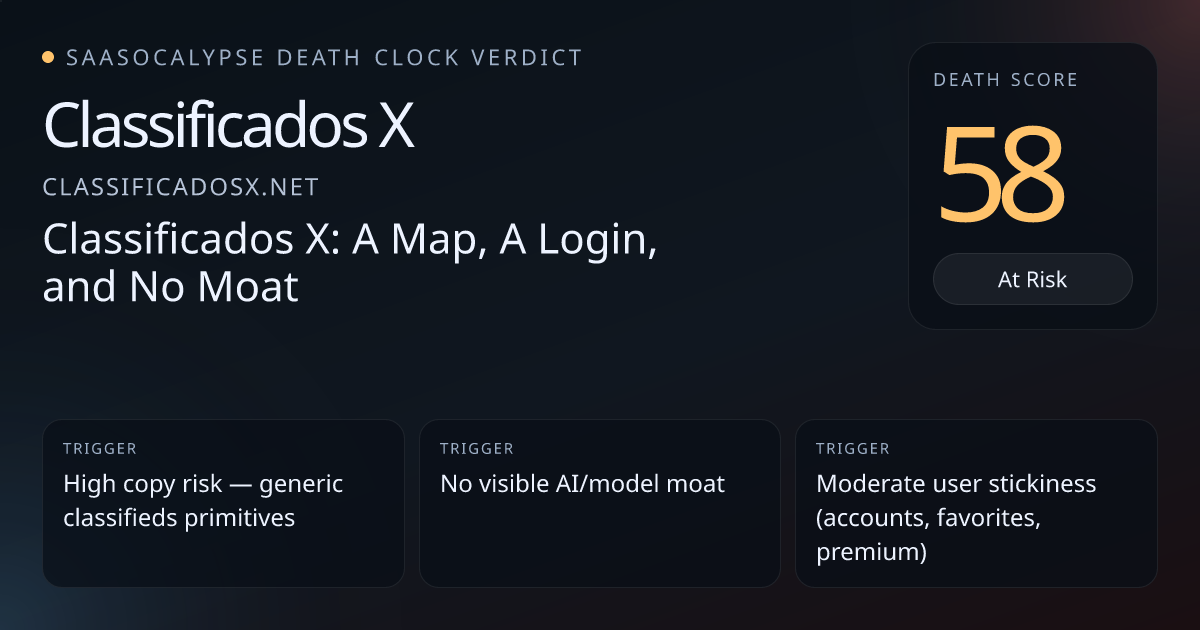 +32 Commodity PressureGeneric classifieds language and common features make the product trivially replicable — little proprietary tech or uncommon UX to prevent copycats.