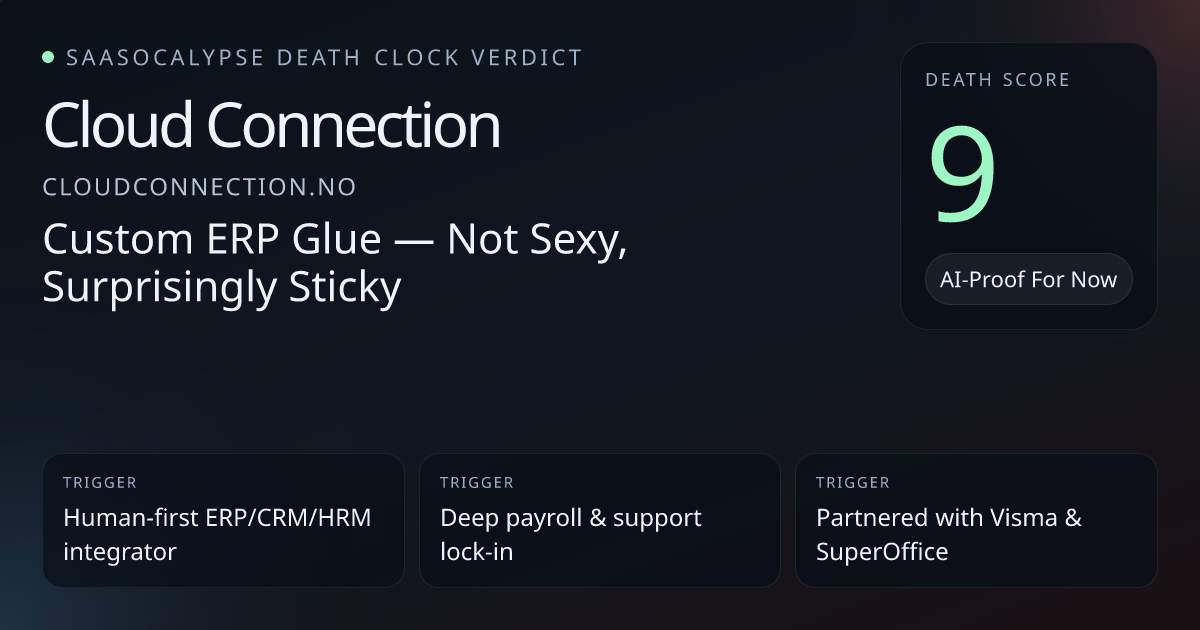 -3 Relative PlacementSlightly less vulnerable — real payroll/ERP integrations, long track record and paid support create meaningful switching costs despite some commodity messaging.