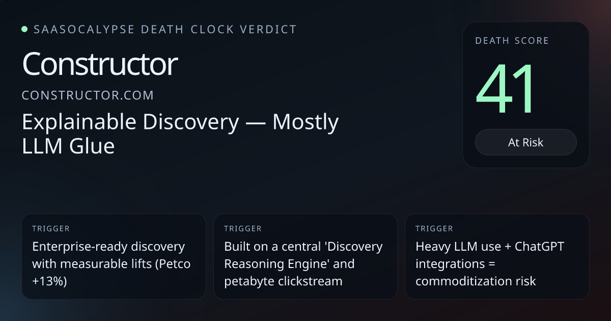 Peer vertical_workflow cohort centers ~46–50 deathScore; Constructor at 37 is notably safer than peers, suggesting some upward reweighting.Heavy 'AI‑native' / 'agentic' marketing and numerous high‑level capability claims increase replaceability risk without clear proprietary model details.Explicit dependence on transformers/LLMs and integrations with external Answer Engines (e.g., ChatGPT) raises third‑party model and prompt‑engineering exposure.