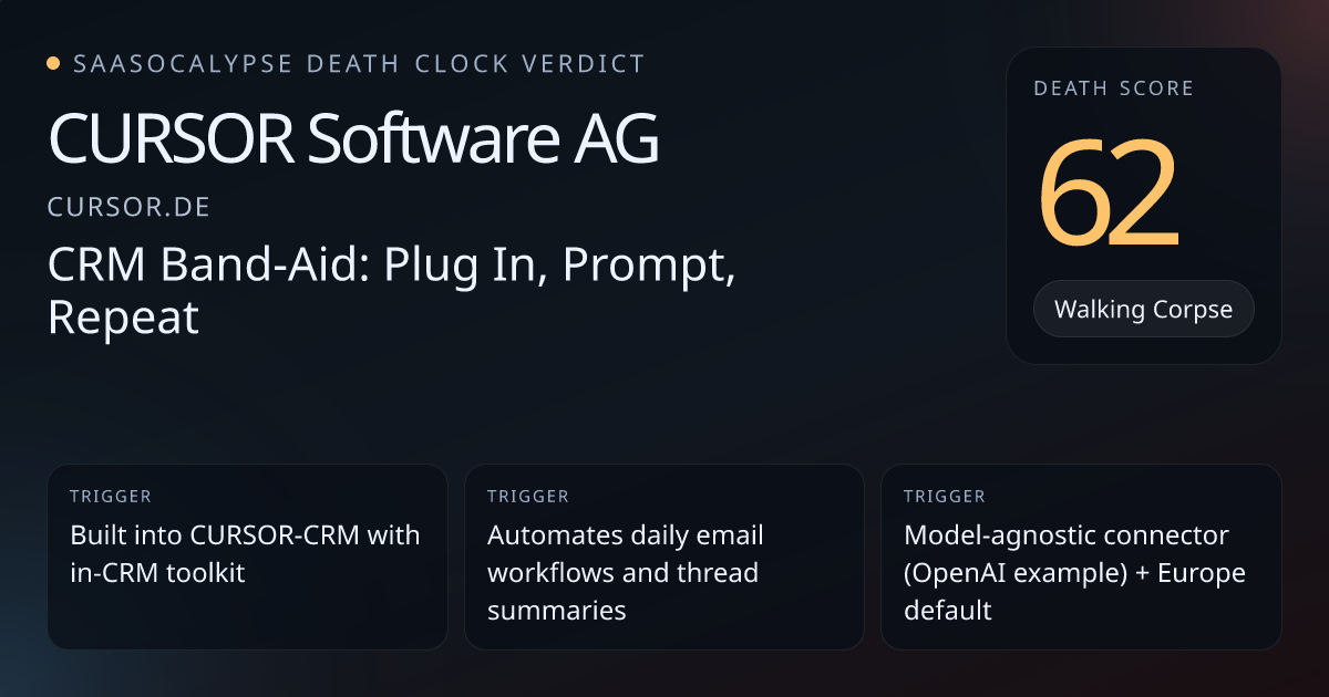 Peer group median sits ~45–55 (At Risk); CURSOR's 72 is notably above similar vertical_workflow companies, suggesting over‑scoring.Product is embedded in CURSOR‑CRM (CURSOR Cloud) with an in‑CRM toolkit — real workflow ownership and distribution that raise switching costs versus a pure prompt wrapper.GDPR emphasis, Europe‑based default model, and explicit data‑deletion/non‑training claims increase enterprise trust and raise the bar for easy replacement.