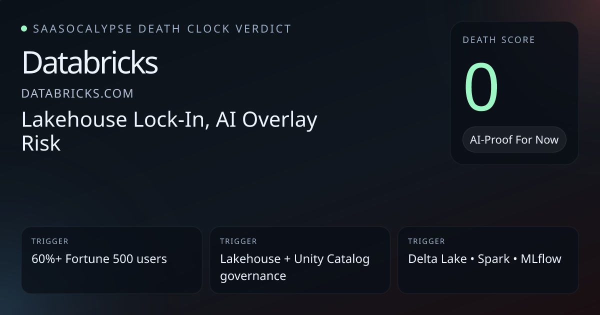 -4 Relative PlacementDatabricks should be rated slightly less vulnerable — deep workflow ownership, data gravity, open‑source entanglement and enterprise distribution outweigh AI-overlay and API dependency risks.