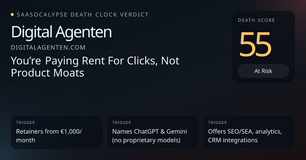Peer cluster: most vertical_workflow peers sit 34–50 (many ~46–50), implying typical agency/orchestration risk is lower than a 68 score.Company reads like a generic digital marketing agency (heavy commodity language, 'Content Generator') — high commoditization risk but common among peers.Strong model dependency: explicit ChatGPT/Gemini references and no proprietary models, increasing swap‑out risk but similar to many comparators (orchestration not model ownership).
