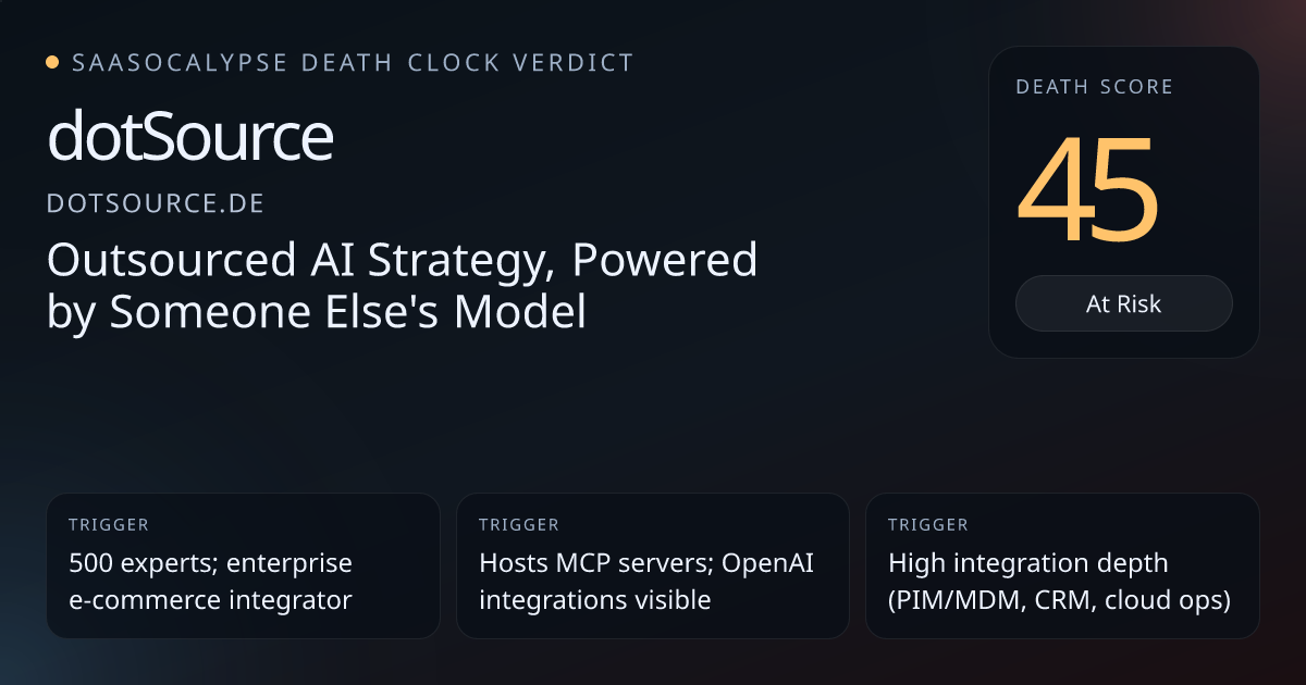 -3 Relative PlacementSlightly less vulnerable — real enterprise integrations, hosted MCP servers and lifecycle ownership create measurable switching costs and embedding despite commodity AI language and OpenAI use.