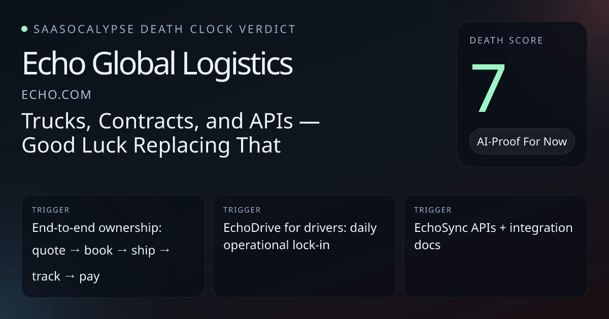 Commodity language and productized names ('EchoConnect', 'EchoSync') increase copyability risk despite physical services (matches factor 'commodity_pressure' = 16).No model or proprietary-ML signals on site — AI claims are marketing-first and therefore easier for competitors to mimic as thin wrappers.True defensive signals exist (end-to-end workflow, EchoDrive driver app, managed transportation, large client claims) so any adjustment should be modest, not drastic.
