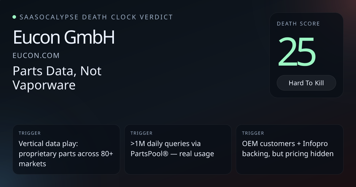 >80 Märkte, for which they supply original replacement-parts data — proprietary dataset implication.>1 Mio. Marktabfragen mit PartsPool® täglich — suggests active user habits and operational reliance.Positioning around Preis- und Produktmanagement — sticky, recurring business processes.