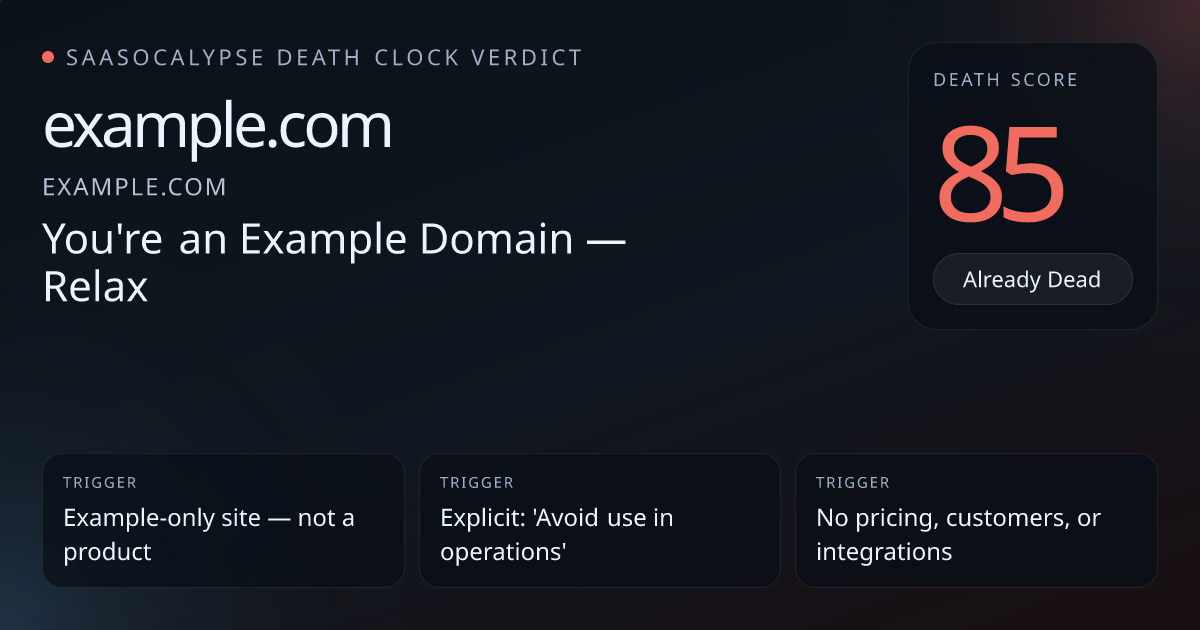 The site is explicitly an example/placeholder domain—productized features are absent, making the 'offering' trivially copyable or replaceable.