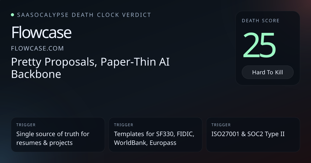 +5 Relative PlacementNudge up: Flowcase shows meaningful enterprise lock‑in (templates, integrations, compliance) but its heavy reliance on third‑party LLMs and surface‑level AI features make it moderately more vulnerable than a 20 suggests.