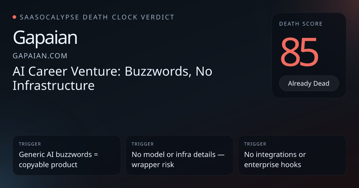 Peer generic_saas entries with similar site-level thinness cluster ~46–65 (many around high 40s–50s); 100 is an extreme outlier.Gapaian's signals (single-line homepage, hidden pricing, no integrations, no enterprise or workflow depth) mirror peers like RECRD and Simpson Associates.Factor breakdown shows high commodity and model-dependency risk but zero workflow/distribution/integration/enterprise defenses — argues for weakness, not necessarily terminal status.