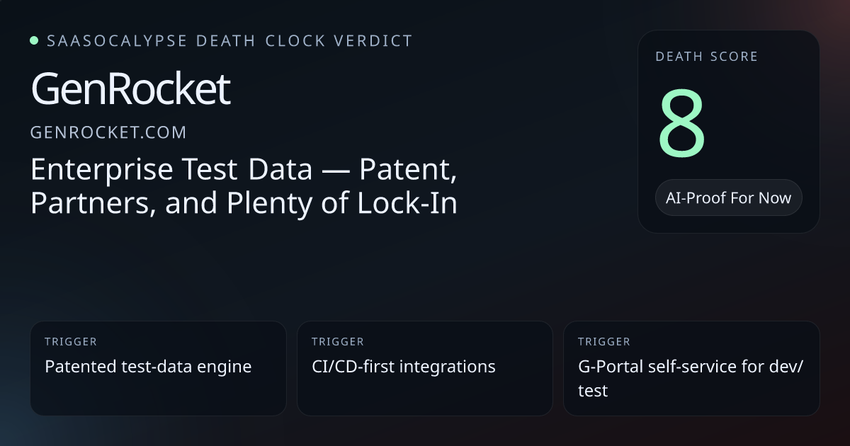 +8 Relative PlacementRaise vulnerability moderately — GenRocket is more exposed than a 0 score implies, but strong enterprise entrenchment, integrations and low model dependence limit downside.
