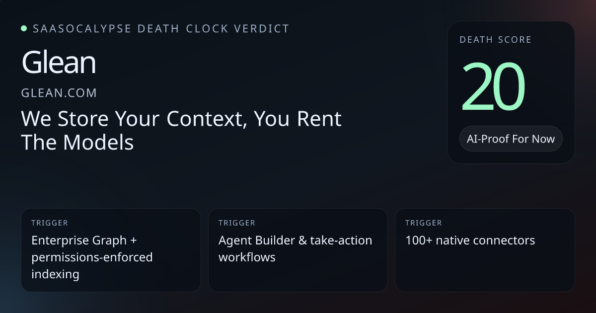 Single‑tenant cloud deployment, permissions‑enforced indexing and Glean Protect signal real enterprise trust and compliance barriers.Enterprise Graph, 100+ connectors, APIs/SDKs and agent orchestration create data gravity and operational lock‑in (higher switching costs).Clear workflow ownership (take action from conversations, Canvas, native collaboration integrations) supports repeated usage patterns.