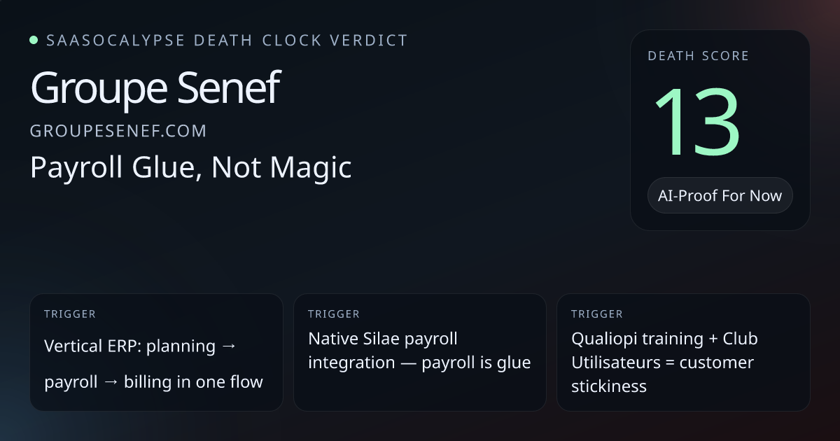 End-to-end operational ownership (planning → payroll → billing + mobile field app) implies daily, mission‑critical use that resists prompt‑level replacement.Native payroll integration (Silae), dedicated sector ERPs (Seenet), and shared tech platform indicate technical integrations beyond a thin API wrapper.Enterprise signals — Qualiopi training, guided deployments, regulatory references (Ségur du Numérique), Club Utilisateurs and multi‑site rollouts — increase procurement friction.