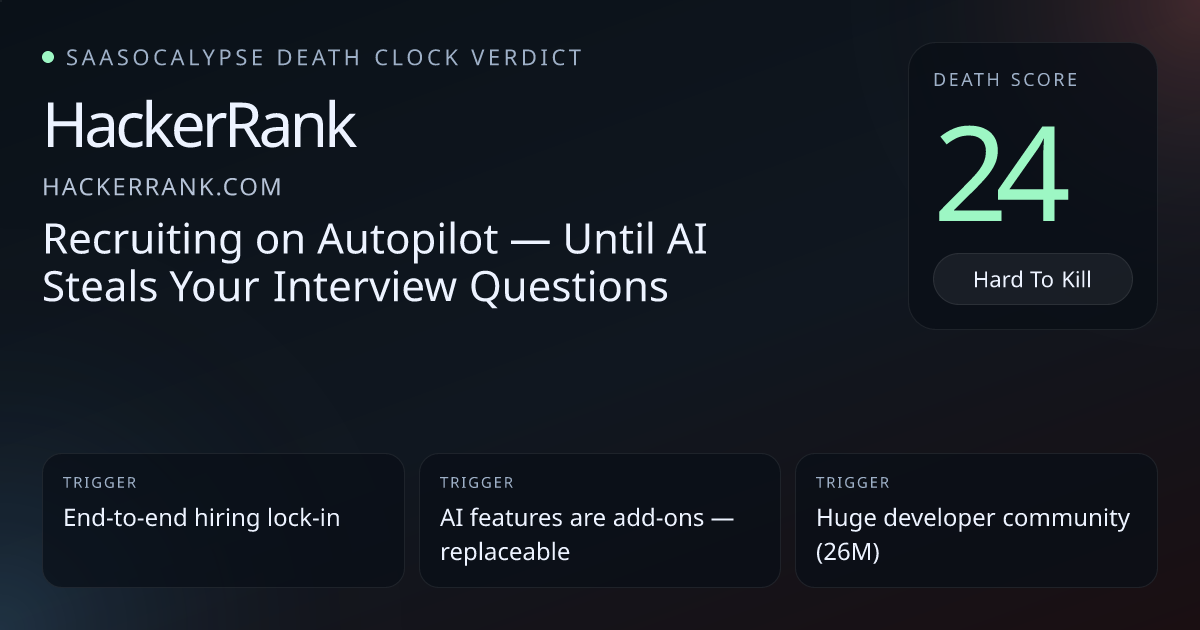 Peer anchors are clustered in the 46–54 'At Risk' band for vertical_workflow products that read as thin AI wrappers; HackerRank shows materially deeper workflow ownership than those peers.High switching costs: large certified content library, skills taxonomy, SkillUp portal and role-based assessments create data/process gravity that peers typically lack.Enterprise trust and compliance signals (proctoring, identity verification, I/O‑validated assessments, validation studies) raise procurement barriers vs. copycat wrappers.