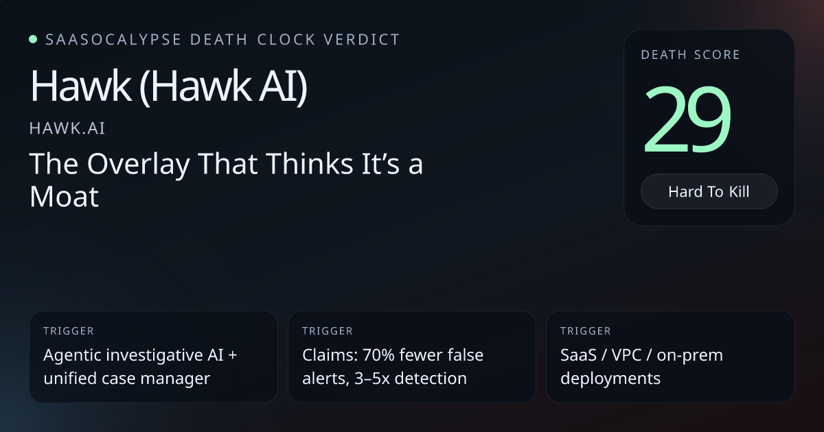 -3 Relative PlacementSmall negative adjustment: strong enterprise workflow ownership, regulatory/gov features and deployment options make Hawk slightly safer than its AI-overlay marketing implies.