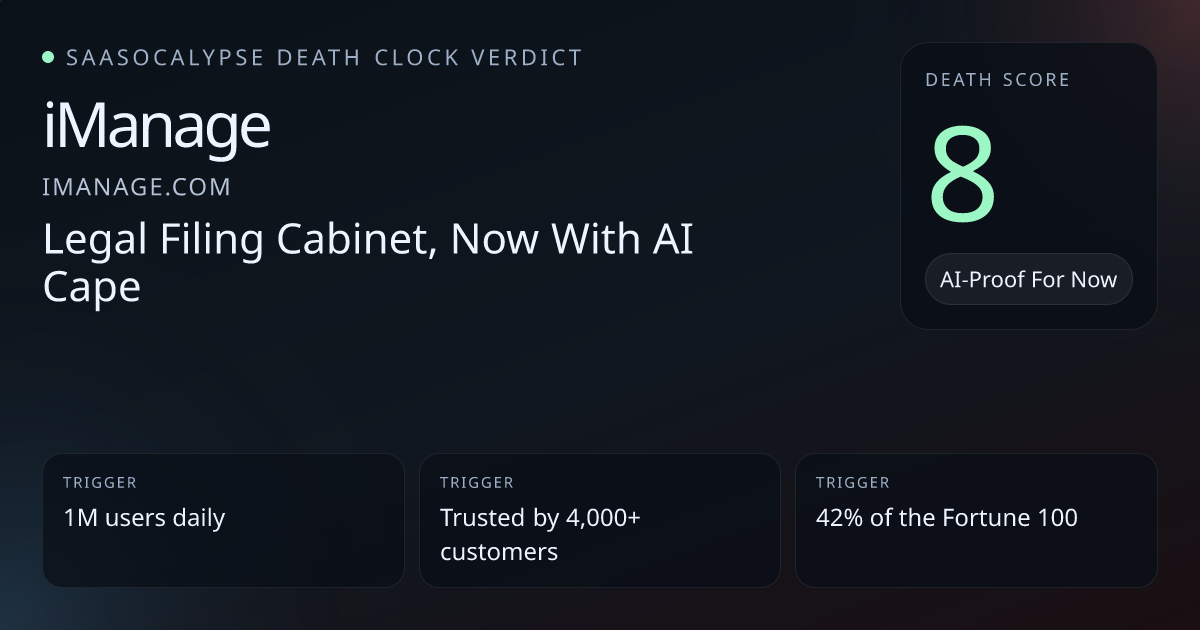 +8 Relative PlacementMove iManage modestly toward higher vulnerability — strong enterprise lock‑in keeps it safer than pure model‑wrappers, but visible model dependency and commodity AI messaging warrant raising its risk above 'AI‑Proof'.
