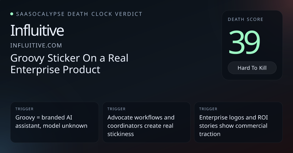 Peer anchors cluster around death scores 46–51 for similar vertical_workflow products that are often thin AI wrappers; Influitive’s current 43 is already below that cluster.Influitive shows substantive workflow ownership (ongoing advocate programs, gamified campaigns, coordinators) which creates operational lock‑in unlike transient app-layer assistants.Clear enterprise signals (large-brand logos, security nav, professional services, case studies, ROI testimonials) raise procurement friction versus peers judged as easily re-creatable.
