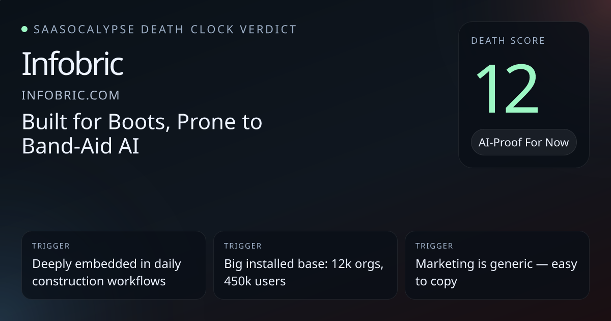 +24 Commodity PressureMarketing leans heavily on generic SaaS buzzwords ('smart', 'digitalisation', 'all‑in‑one'), making core features easy to imagine as copyable AI or platform add‑ons, though construction domain specifics limit pure commodification.