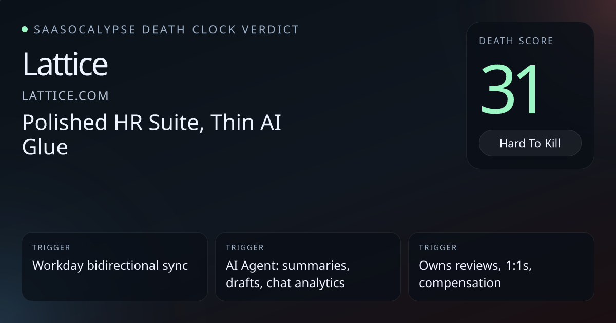 +6 Relative PlacementModest upward tweak: Lattice is more exposed to commoditization than a 25 implies (generic AI marketing + opaque model dependence) but its deep HR workflow ownership and enterprise integrations keep it well below peer 'At Risk' levels.
