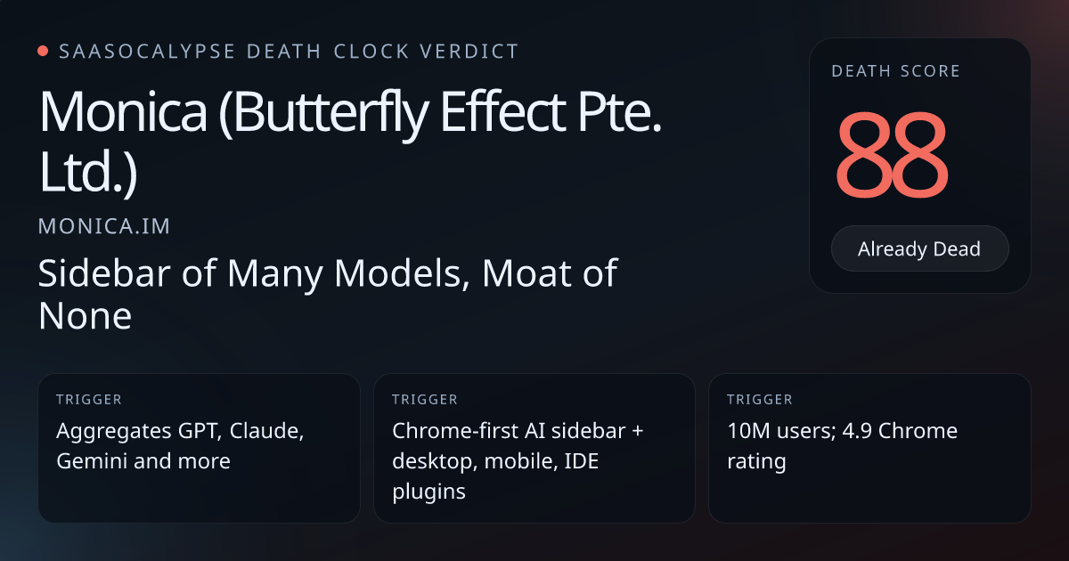Explicit listing of GPT-5, Claude 4.5, Gemini 3 Pro, Nano‑Banana, Sora 2FAQ: 'Monica is a chrome extension powered by GPT API'Supports many external image/video models (DALL·E 3, Stable Diffusion, Runway)