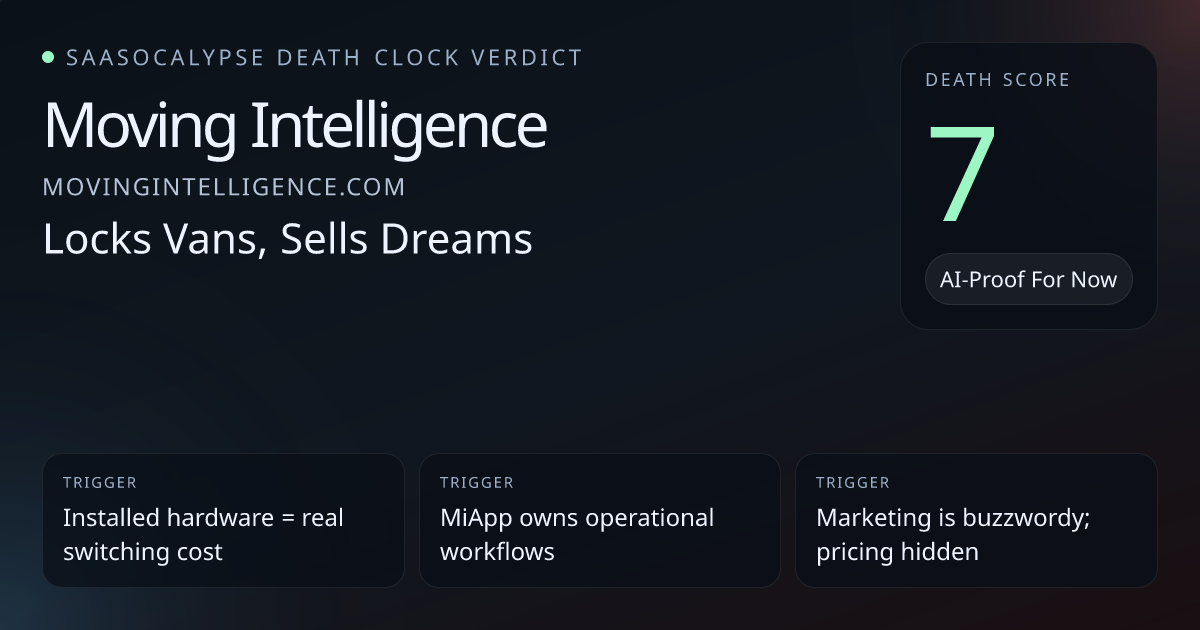 Installed on-vehicle hardware plus MiApp create device/data gravity and real switching costs (factor_breakdown: switching_cost=12, integration_depth=8, workflow_ownership=12).No AI positioning or model-dependency markers visible on the site (model_dependency_risk=0).Enterprise trust signals (25+ years, company registration, conference participation) and a partnership with Echoes suggest real B2B traction rather than thin consumer copy.