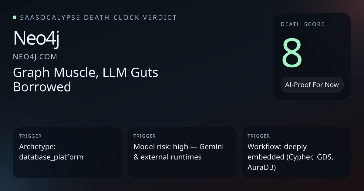 +8 Relative PlacementIncrease vulnerability moderately — Neo4j is a strong, entrenched graph platform but its AI-facing agent productization and commodity-facing messaging make a 0 score inconsistent with peer DBs.