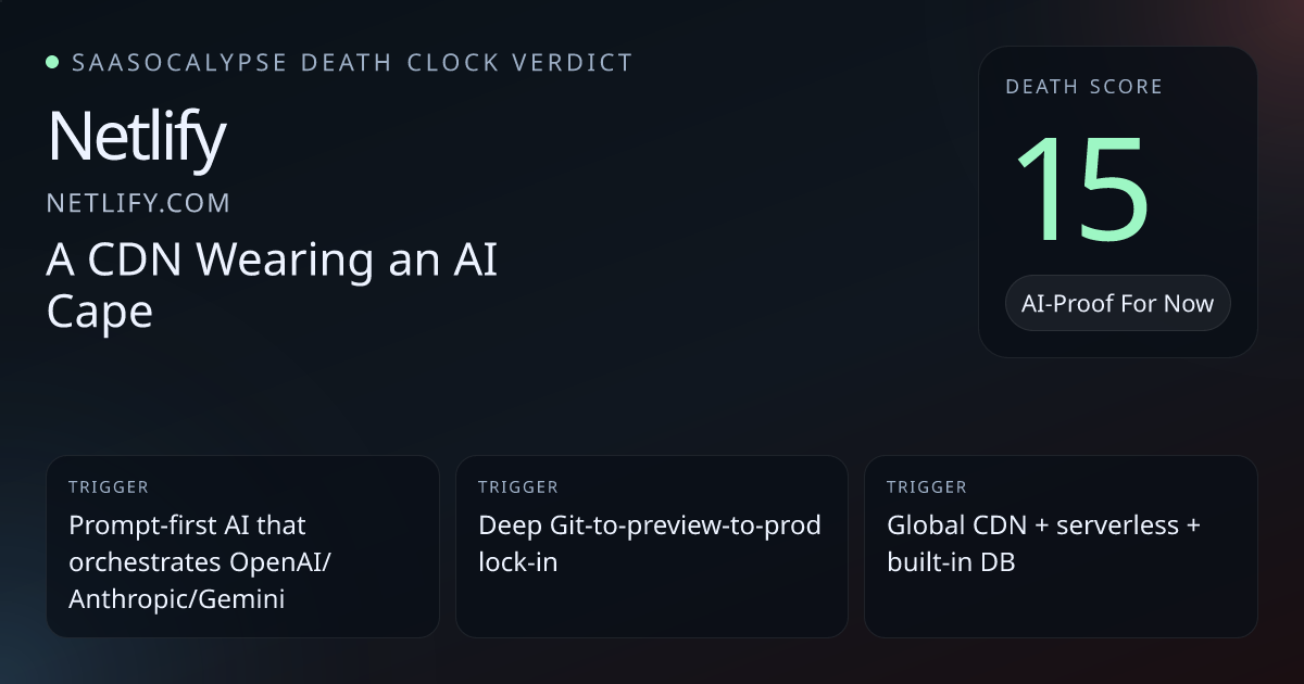 High model dependency: AI Gateway explicitly orchestrates OpenAI/Anthropic/Gemini (orchestration, not proprietary models).Commodity language: repeated 'zero‑config' / 'start with a prompt' positioning increases risk of feature commoditization.Meaningful platform defenses: deep Git->preview->deploy workflow, integrated DB/storage, CDN/edge and enterprise SLAs create real switching costs and embed Netlify in teams.