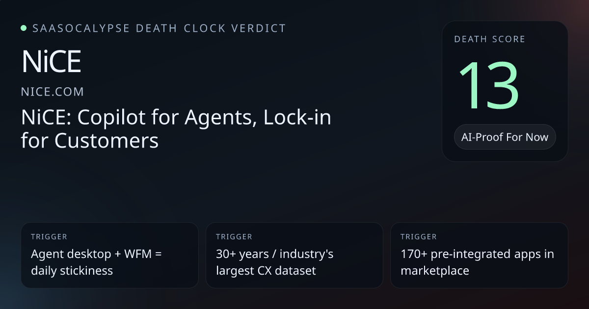 Peer vertical_workflow set clusters around deathScores ~46–54; current 7 is an outlier, so some upward calibration is reasonable.Strong enterprise defenses: Gartner MQ leadership, 20B+ interactions/year, 25,000+ brands, workforce management and agent workspace signal real switching costs and mission‑critical usage.Deep integrations and platform signals (170+ pre-integrated apps, streaming connectors, Snowflake listings, unified data model) materially raise cost to replace vs typical 'wrapper' products.