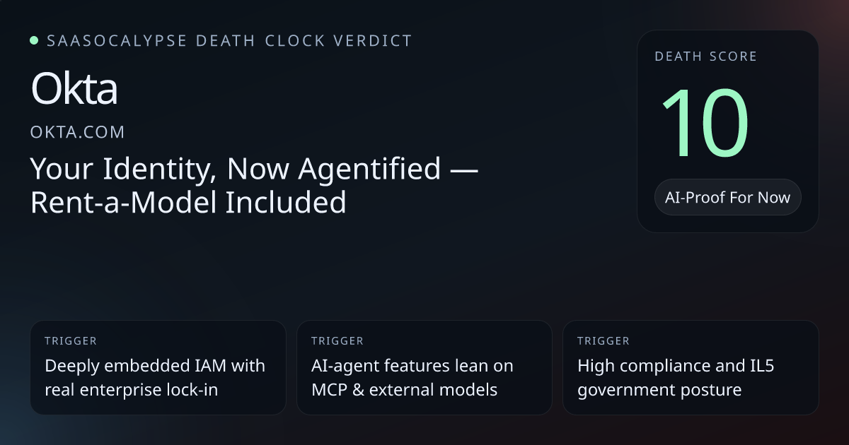 +10 Relative PlacementModest upward shift — Okta's strong enterprise moats matter, but visible model-dependency, early‑access AI features, and commodity‑sounding positioning make it more vulnerable than a 0 suggests.