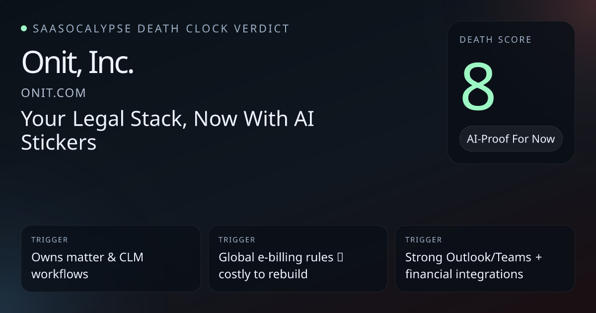 Owns mission‑critical legal workflows (matter/CLM, e‑billing, approvals) that create daily dependency and structured data hard to replicate.Global e‑billing rules library, financial reconciliation integrations and multi‑entity deployments increase switching friction.Platform markers (Unity, App Catalog, Workflow Studio, Onit Services) and named enterprise customers indicate mature monetization and procurement familiarity.