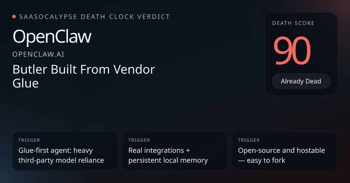 Peer context: similar ai_wrappers sit at 88–94 (Monica 88, Anything 88, SaaSocalypse 92, Crunched 94) — OpenClaw is in the same band but shows some stronger user hooks.Workflow depth: persistent memory, autonomous background tasks, and users reporting daily/essential use create real habit and data gravity that raise switching costs above typical thin wrappers.Integration and platform markers: concrete Gmail/Calendar/WordPress integrations plus hot‑reloadable skills and local/CLI hosting produce substantive per‑user embedding rather than purely superficial demos.