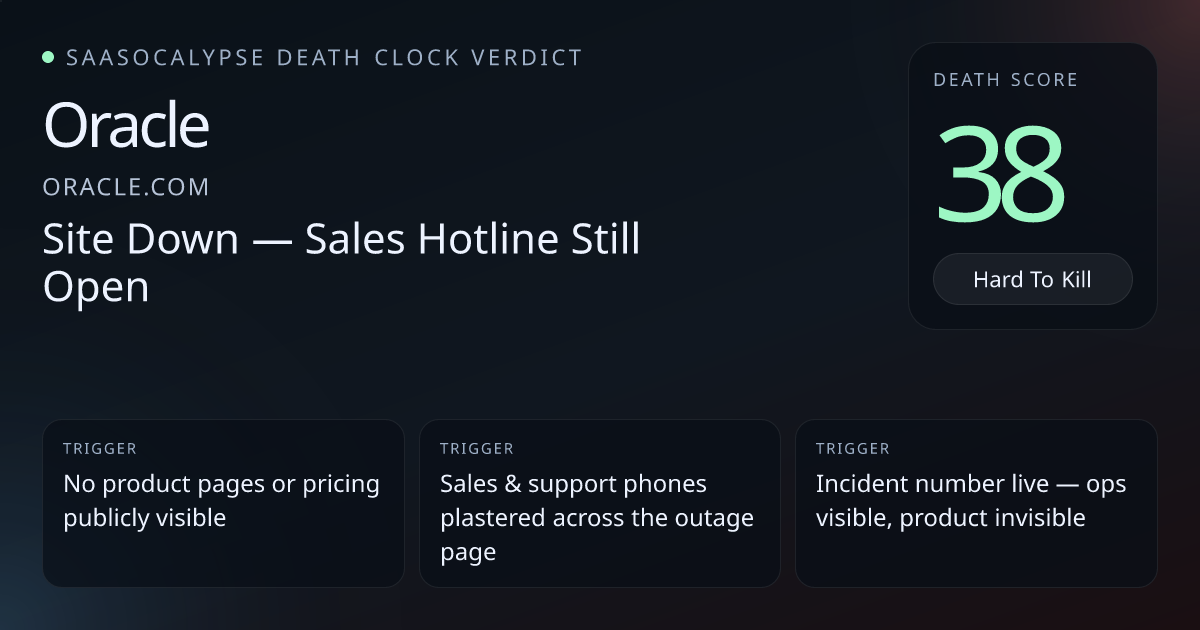 Peer anchor treatment: other entrenched enterprise platforms (Salesforce deathScore 3, MongoDB 11) are rated far more AI-proof despite comparable marketing/model opacity — suggests platform archetypes deserve strong defensive credit.Extraction shows clear enterprise markers (direct sales numbers, corporate HQ, technical support, incident tracking) consistent with procurement-ready, high-switching-cost posture.Oracle's known product breadth (databases, middleware, cloud infra, SaaS) creates integration depth and long-term contracts not visible from a transient homepage outage.