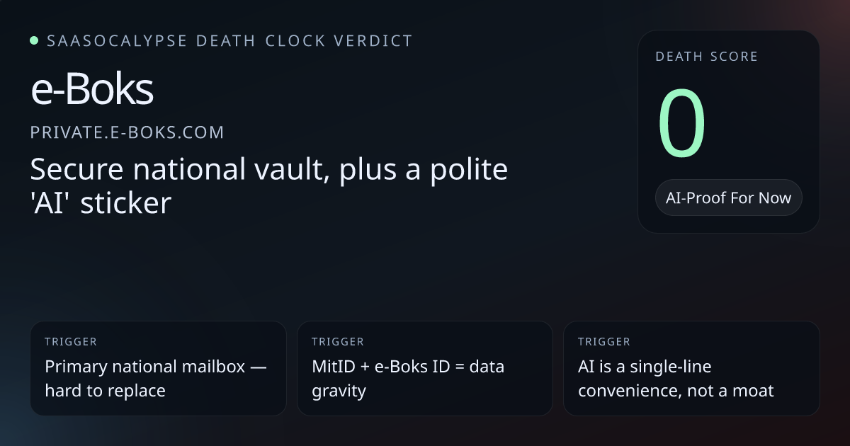 Integration with MitID and proprietary e-Boks ID creates strong identity binding and login friction.Primary mailbox for official/banking/insurance documents: 5.4M users, 598M documents/year and 35M monthly visits indicate frequent, mission-critical use.Deep integrations: banks and insurers send post, in-app e-Wallet, digital signing and bill payment — not just a UI wrapper.