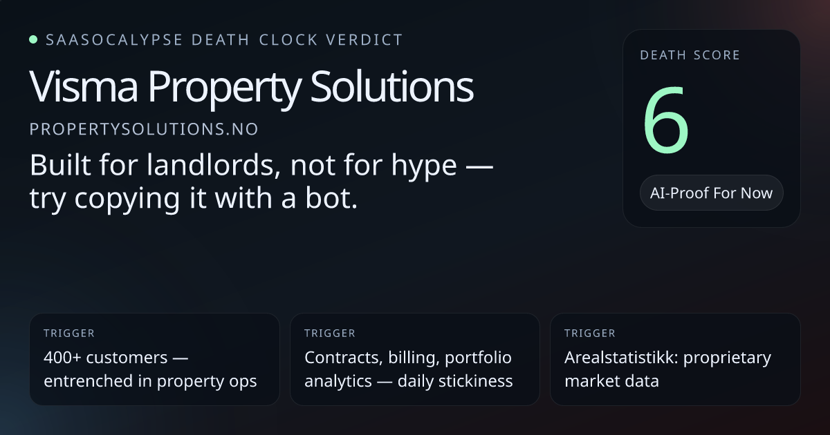 Commodity marketing language ("Komplett plattform", "Unik innsikt", "Ta bedre beslutninger") makes analytics/insights components attractive to commoditization or assistant substitution.No visible AI/model dependency—reduces immediate fragility from model-wrapping but also means no model-based moat to defend against clones.Strong workflow ownership (contracts, invoicing, lease management) and high switching costs (historical billing, portfolio analytics, Arealstatistikk data) provide real lock-in.