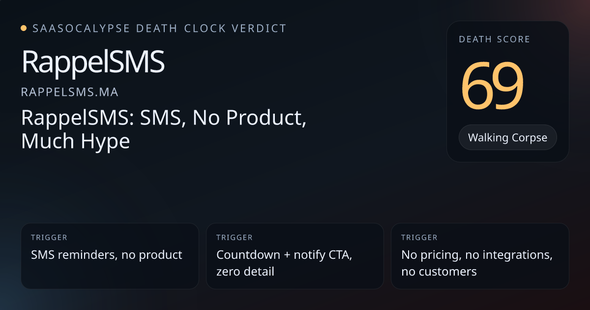 Peer vertical_workflow cohort clusters ~45–55 (many at 46–55); RappelSMS at 79 is a large outlier vs category anchors.Site shows only a coming‑soon SMS reminders landing page with no integrations, customers, pricing, or enterprise signals — risky but typical early‑stage noise rather than inevitable death.Commodity nature of SMS features raises vulnerability, but peer entries with thin product/AI positioning were scored in the mid‑40s to mid‑50s, so a moderate downward calibration is appropriate.