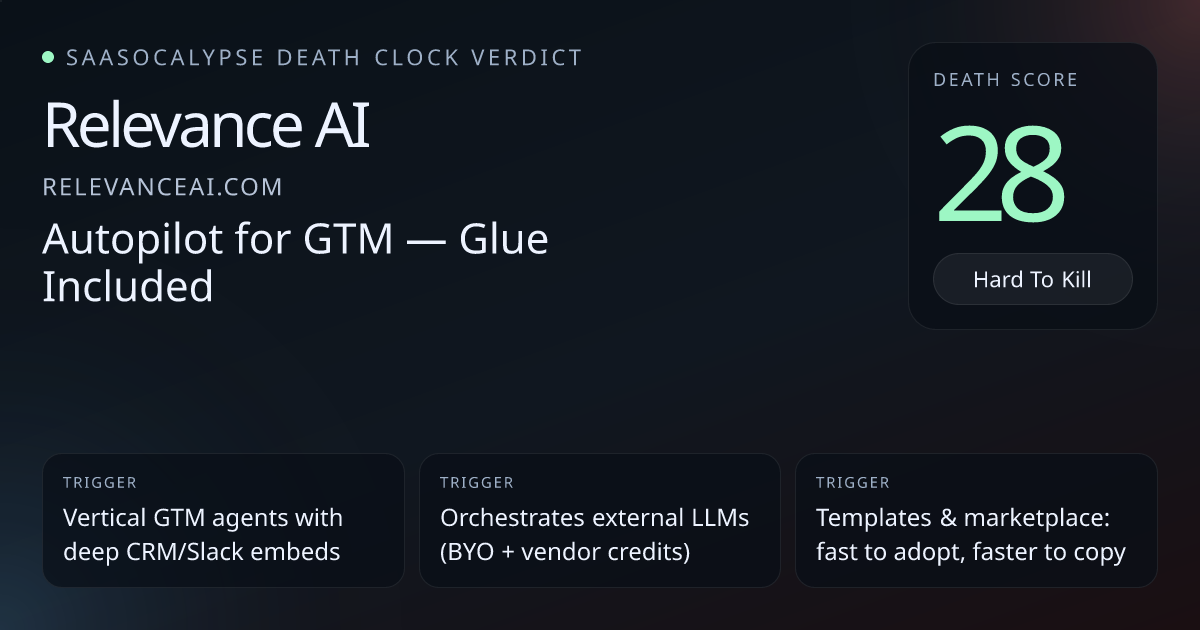 +32 Commodity PressureMarketing-forward, template/marketplace focused messaging and broad transformational claims make the product look easy to copy or compress into an LLM feature.