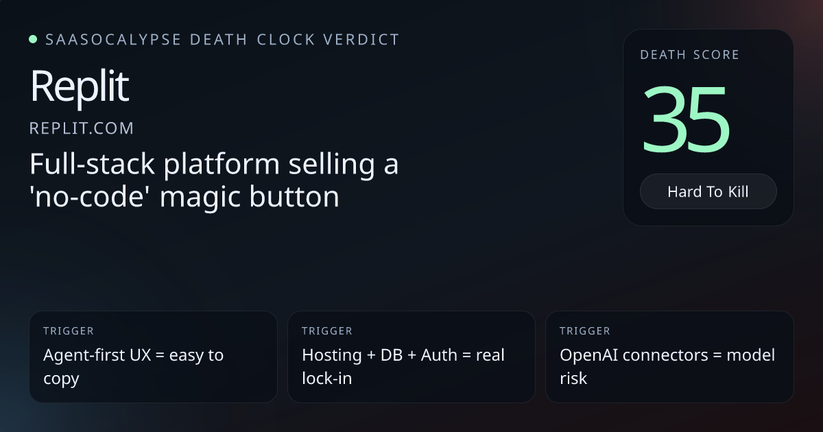 Compared to Cursor (developer_workbench, deathScore 47) Replit shows stronger platform signals (managed hosting, DB, auth) that create real data gravity and workflow lock‑in.Multiple enterprise trust signals (SSO/SAML, SOC 2, RBAC, SCIM, private deployments, single‑tenant options) increase procurement friction for would‑be replacers.Built-in infrastructure (serverless SQL DB, hosting, secrets, monitoring, production/dev separation) raises migration cost beyond a thin model wrapper.