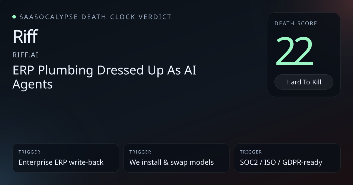 Peers with similar scores (Highstreet 26, valantic 23, Air IT 23, Resillion 21) cluster around 20–26; Riff's profile aligns with that cluster but shows marginally stronger workflow lock‑in.Deep workflow ownership markers: order‑to‑cash/procurement/finance automation, agents 'write to real systems' and 'workflows go live in daily operations' increase stickiness vs thin wrappers.Integration and engineering signals: ERP write‑back, deployable Python/FastAPI stacks, exportable audit logs — stronger technical barriers than pure marketing-led integrators.