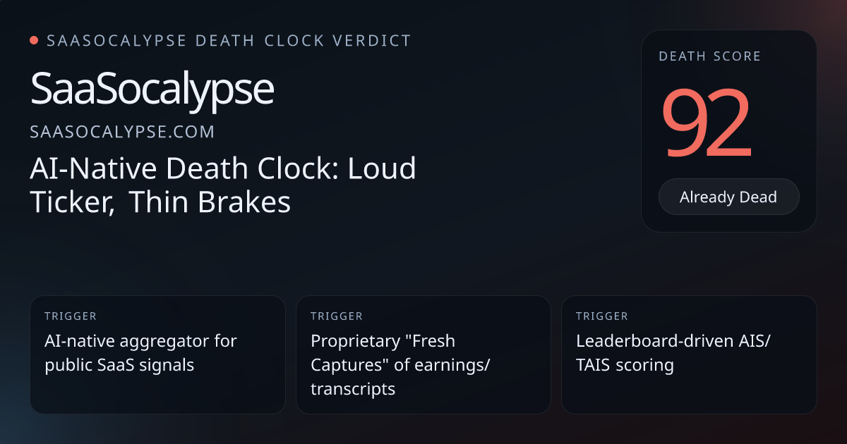 Peer anchor Anything (ai_wrapper) scored 88 — similar archetype and 'Already Dead' band suggests 100 is an outlier without stronger unique failure evidence.Proprietary 'Fresh Captures' dataset and canonical product pages create some switching friction and reproducible research value (limited moat).No visible enterprise integrations, pricing, or customer proof keeps substance thin and risk elevated relative to deep platforms.