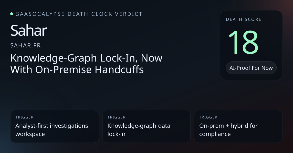 Several peer vertical_workflow platforms with platform/enterprise claims sit much higher (Onclusive 36, Cymulate 35, Hubexo 36), indicating category-level compression pressure.High commodity_pressure score and marketing phrases like 'actionable intelligence' and 'agentic AI' suggest parts of the value prop could be productized or rewrapped by large models or platform vendors.Defensive signals (knowledge graph, on‑prem/hybrid deployment, consulting, government wins, analyst workflows) are strong — argue against a large increase, so move modestly.