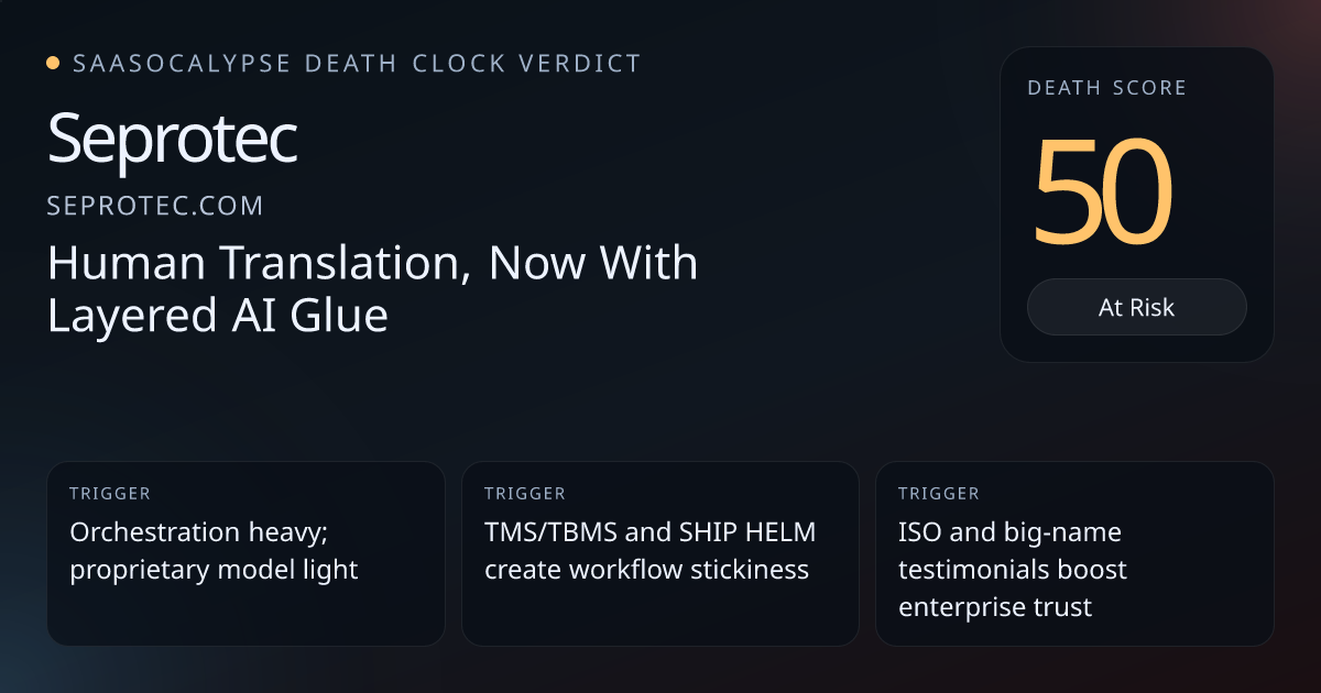 TMS/TBMS, terminology management, client portals and SHIP HELM IP platform imply real recurring workflows and data gravity (higher switching cost than a thin AI wrapper).Enterprise trust signals (ISO certifications, 25+ years, testimonials naming Interpol and Telefónica) support procurement stickiness vs. pure product marketing.Model dependency and marketing gloss (multi‑engine MT/LLM orchestration, 'Seprotec AI' language) raise commoditization risk but read as orchestration layered on top of entrenched services rather than a replaceable consumer app.