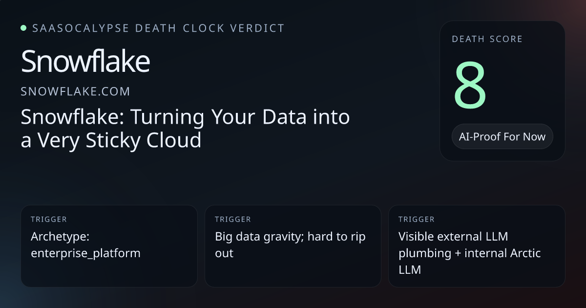 +8 Relative PlacementModestly more vulnerable — strong enterprise embeddedness protects Snowflake, but pronounced AI marketing, third‑party LLM plumbing, and wrapper‑style product framing justify raising its fragility relative to a 0 score.
