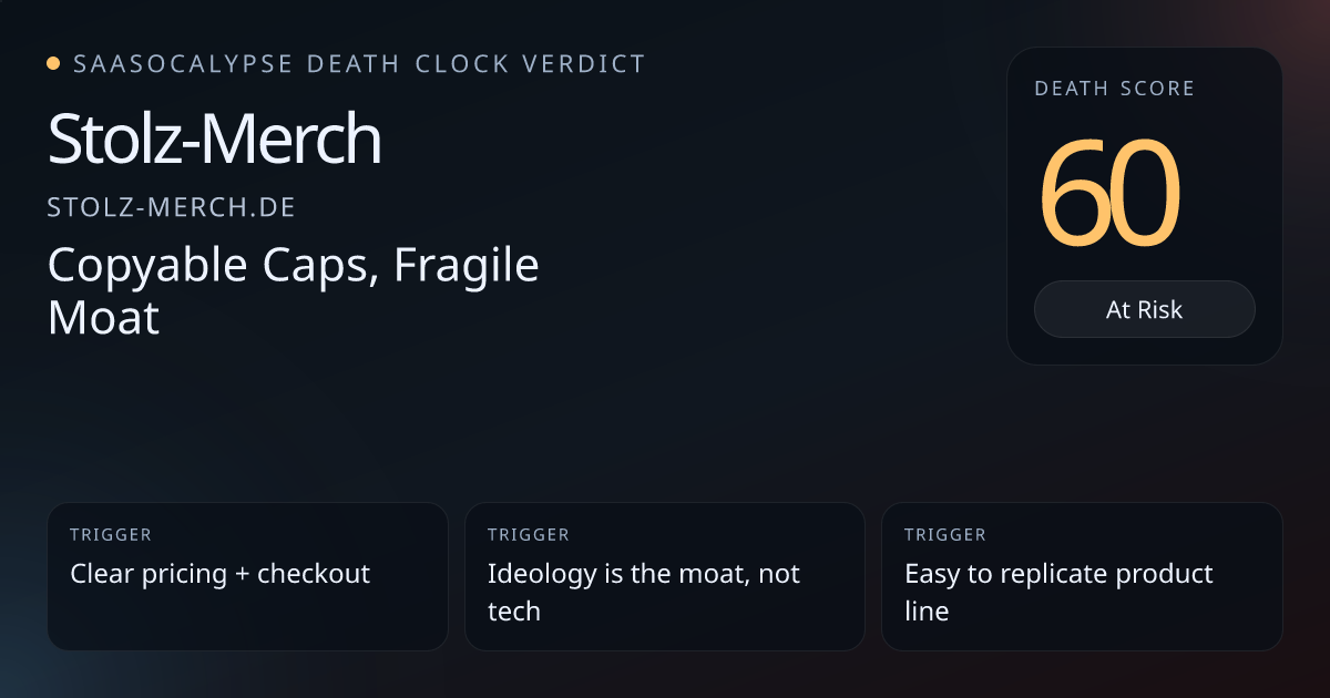 Extraction shows core product is physical e‑commerce (political apparel & accessories) with clear prices and single‑transaction checkout — not a software product.No AI, machine‑learning positioning, or model dependence visible — unlike many high‑risk SaaS peers that hinge on model claims.No enterprise, integration, or distribution ecosystem markers (APIs, partners, procurement) that typically amplify SaaS fragility.