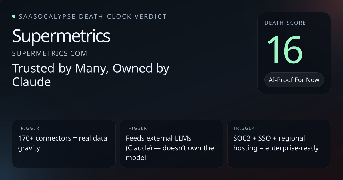 -3 Relative PlacementSmall downward adjustment — defensive signals (data gravity, deep integrations, enterprise controls, activation loops) outweigh AI-wrapper vibes; as a database_platform archetype it needs stronger evidence of fragility before moving up.