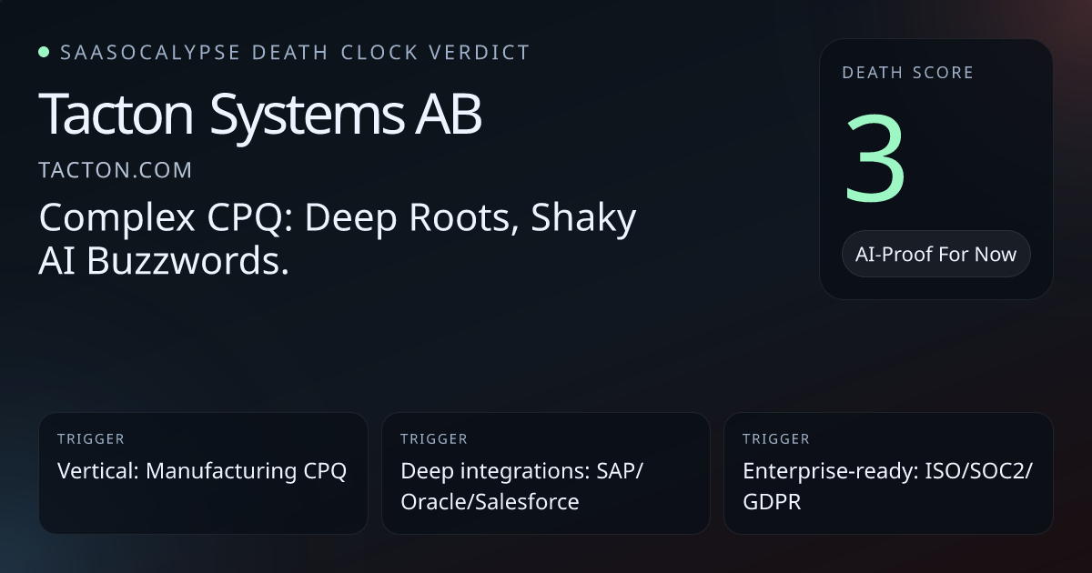 Deep workflow ownership and high switching costs (ETO, CAD ties, ERP/CRM integrations, 25+ years, 250k monthly configurations) argue for defensibility.Enterprise trust signals and analyst leadership (Gartner/Forrester/IDC, ISO/SOC2/GDPR, 24/7 support) increase procurement friction for attackers.AI messaging is prominent but lacks model provenance or vendor/architecture detail, creating modest model‑dependency/commoditization risk.