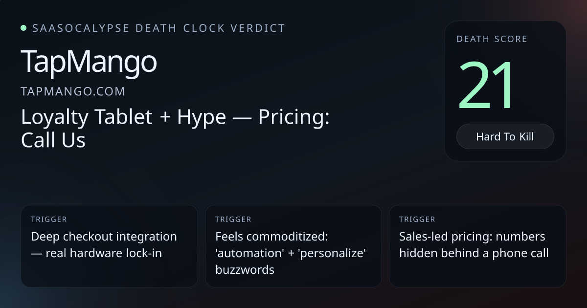 -3 Relative PlacementModest downward tweak — real hardware, POS integrations, and switching costs make TapMango slightly less vulnerable than its score implies despite commodity messaging.